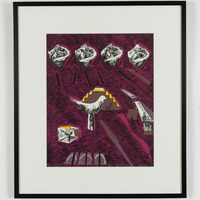 abstract black and white drawings of two birds (center, bottom left), a bench (left of center bird), and a series of four roses (top) against a purple background.