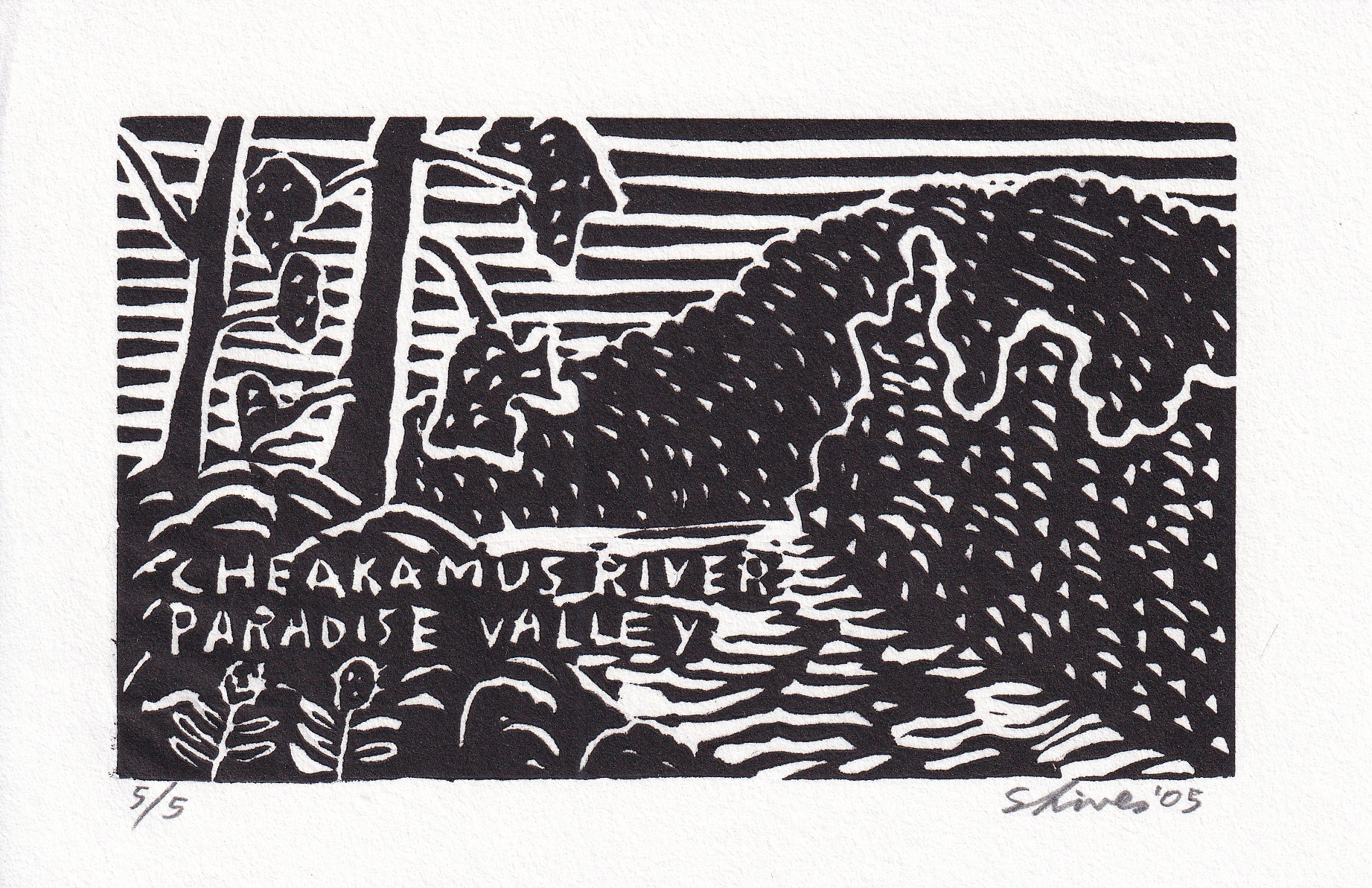 - Cheakamus River relief print in Arnold Shives files - likely made during Paradise Valley Summer School of Visual Arts in 2005