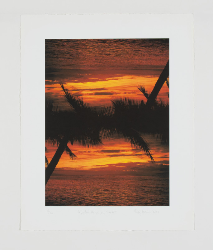 Print of a vivid tropical sunset with silhouetted palm trees mirrored to create a symmetrical reflection. The sky glows with rich hues of orange, red, and yellow