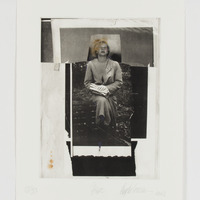 Woman sitting on chair with gloves on her lap. She has a defiant look on her face and is in a fancy 60s style dress, she has her chin tipped back and her chest a little forward and slumpy. There are abstract shapes around the photo image. All is in grayscale.